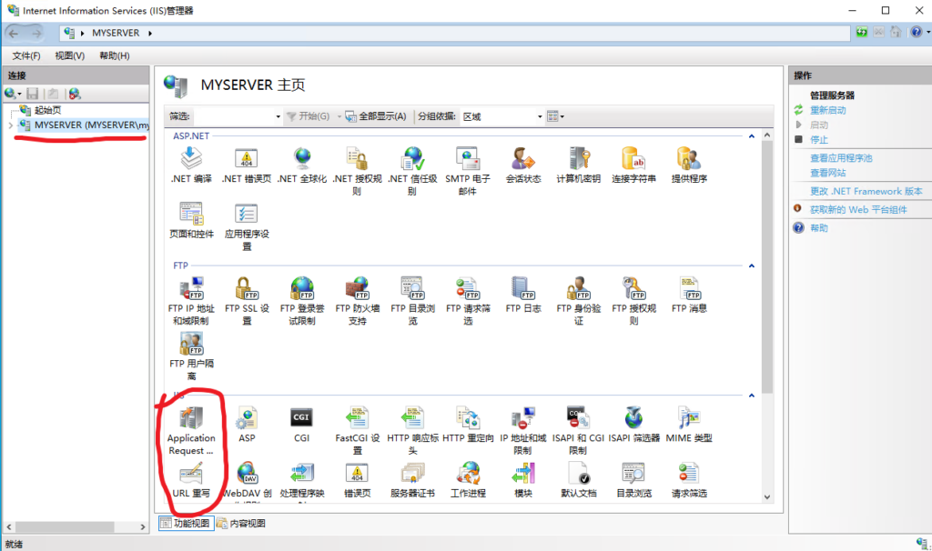 选择服务器,查看是否有”Application Request Routing Cache“和”URL重写“。