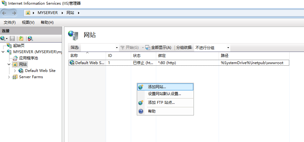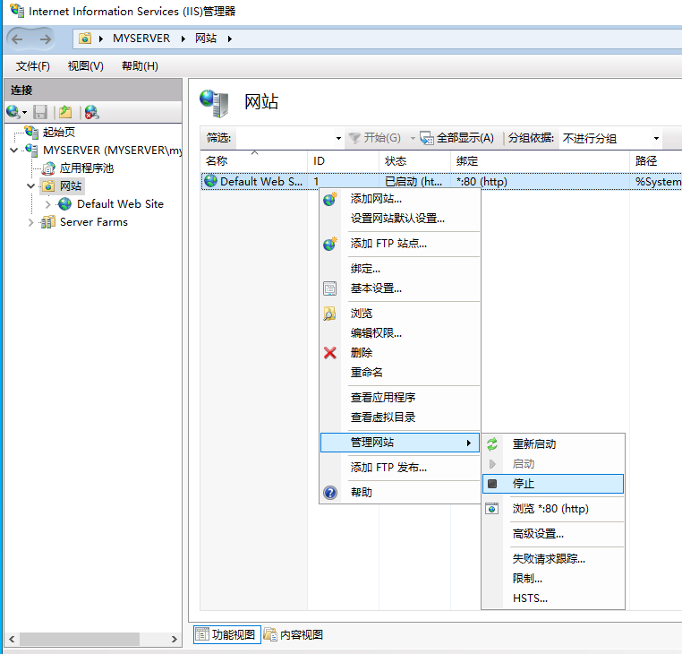 所以停止默认的网站,也就是IIS的欢迎界面。此界面会占用http默认的80端口。