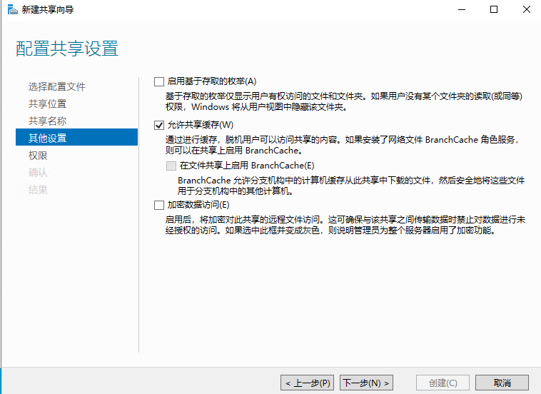 加密数据访问【勾选后会导致所有用户强制使用SMB3.0协议,会导致win7无法访问共享文件(win7默认只支持到smb2.1。可设置允许未加密的客户端访问https://learn.microsoft.com/en-us/previous-versions/windows/it-pro/windows-server-2012-R2-and-2012/dn551363(v=ws.11)?redirectedfrom=MSDN】【另外勾选后一定程度上可防止数据传输时出错的概率】