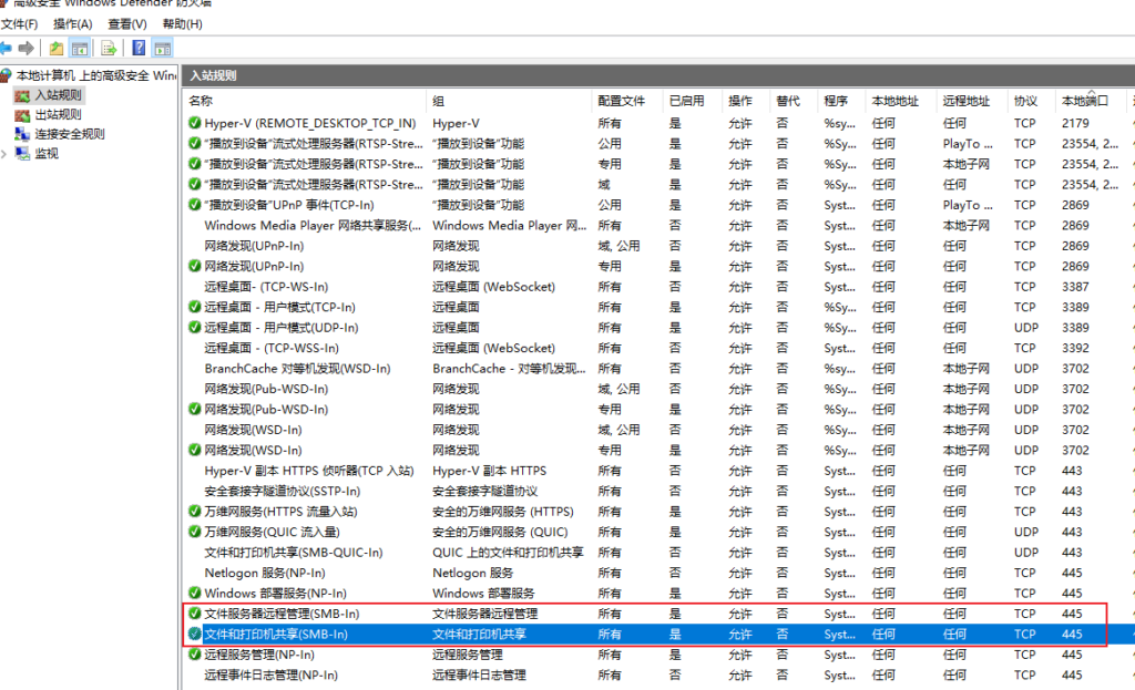 安装完成后,防火墙会自动配置入站规则和出站规则,SMB默认使用445端口。
